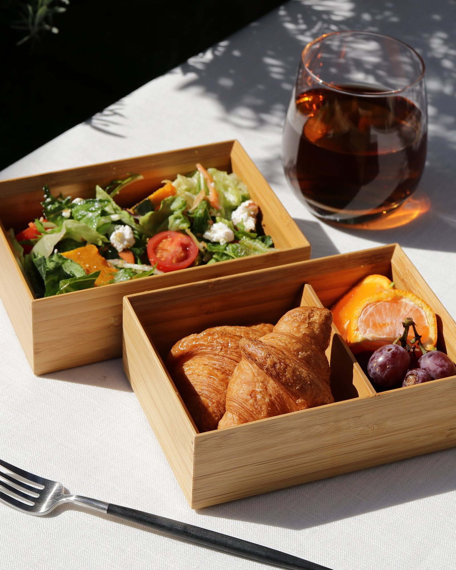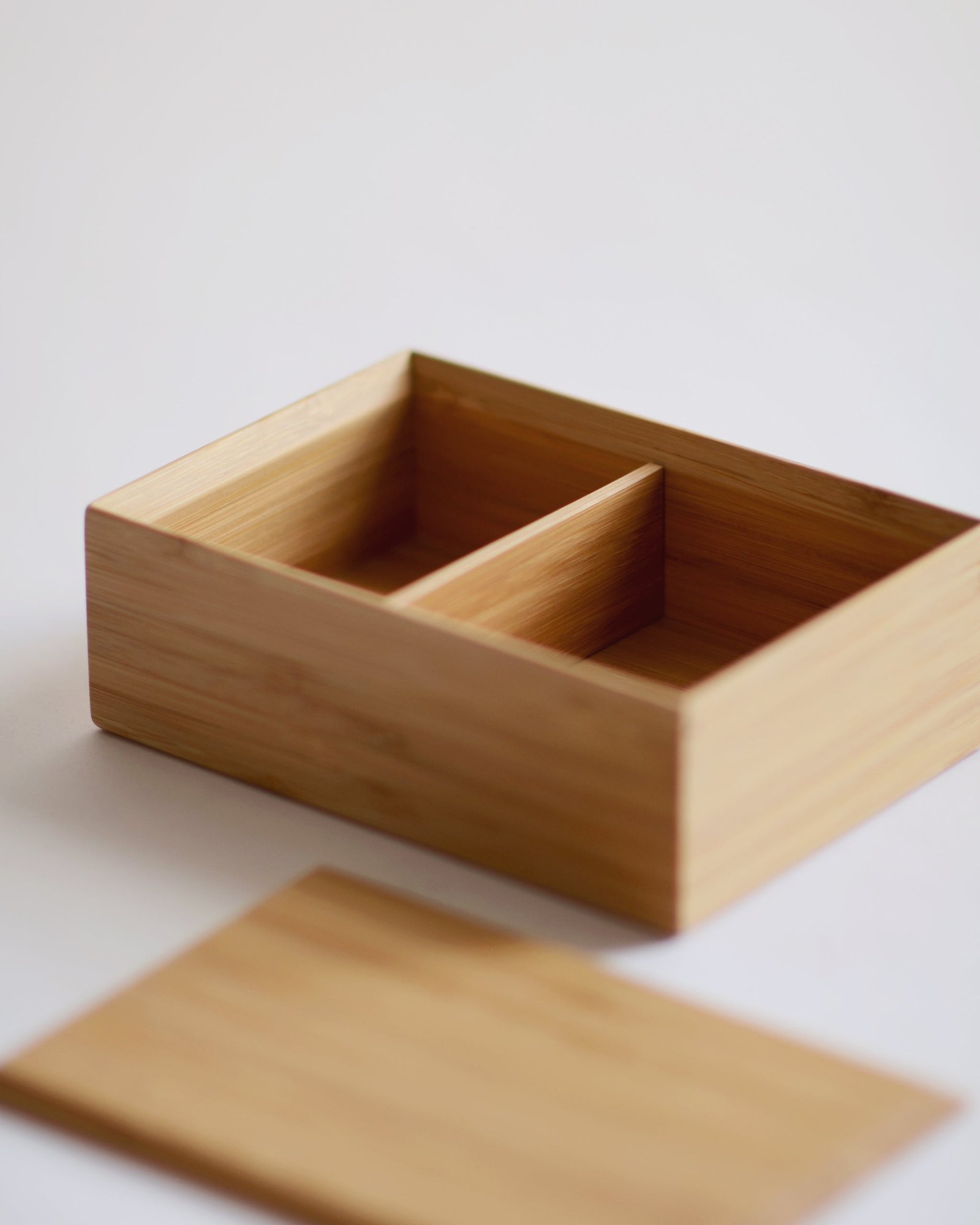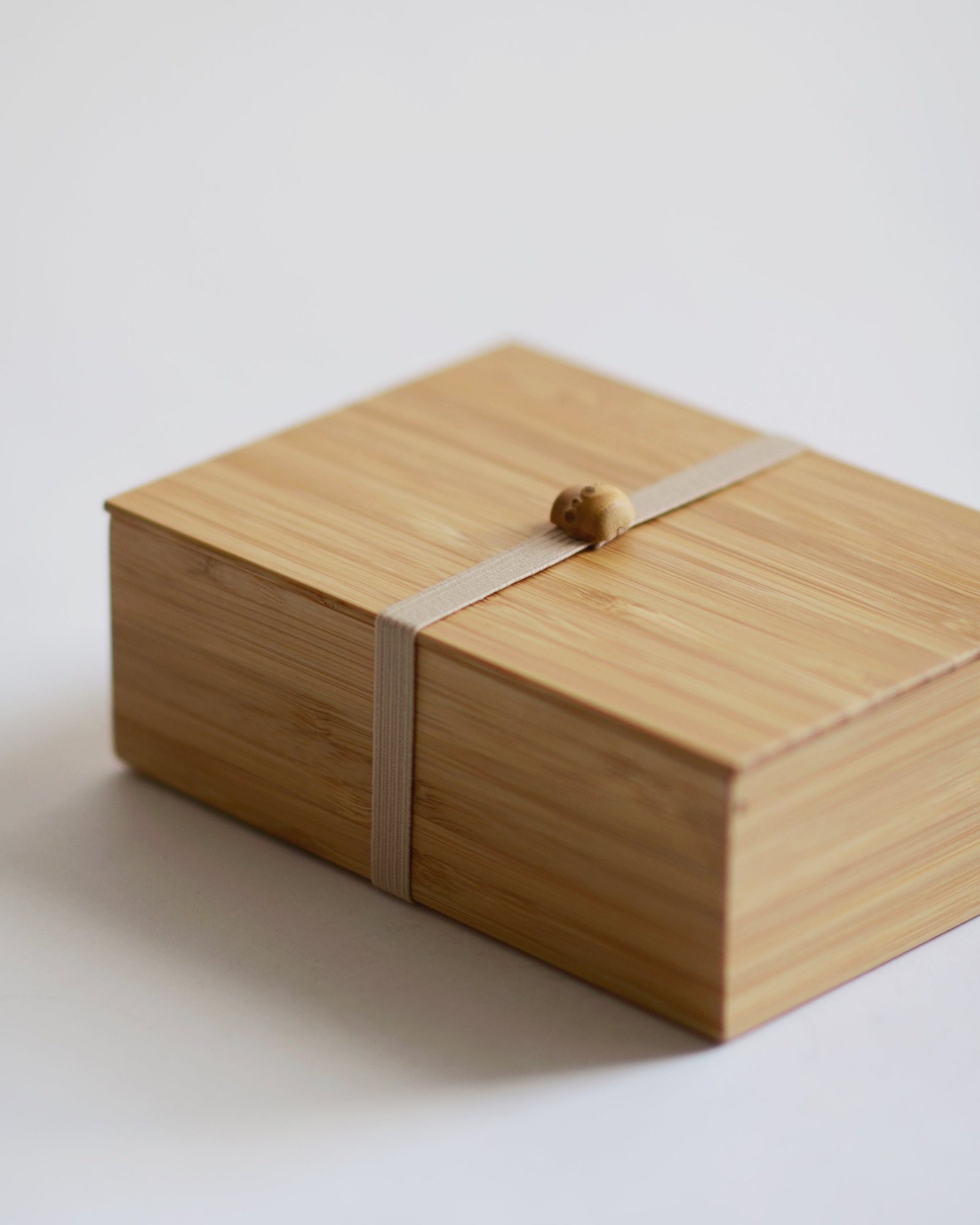 I am a Bamboo Bento Lunch Box. Packed with love, I keep your lunch in line, flavors happily separated, with a bamboo band that holds it all together—rooted in tradition with a twist.